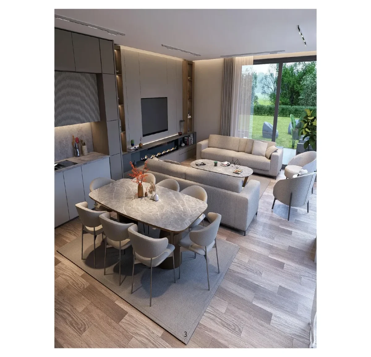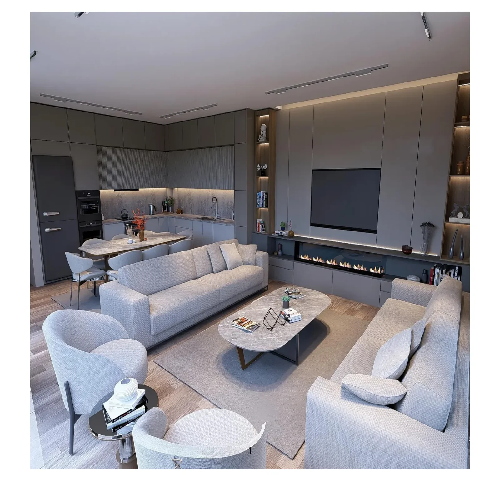 Projede kullanılan lake kapılar, ahşap duvar kaplamaları, vestiyer, dresuar, TV ünitesi gibi özel tasarım mobilyalarla yaşam alanlarınızda estetik ve fonksiyon bir arada.